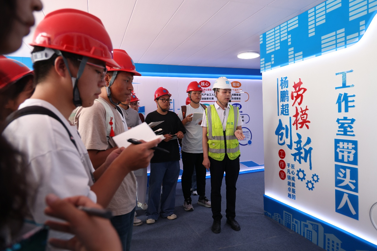中建四局作为驻芜央企,通过开放项目现场和劳模创新工作室、展示创新成果的方式,为大一新生搭建了认知行业、接触企业的平台。活动伊始,同学们在杨鹏超带领下参观了芜湖南站科技园项目建设现场。作为芜湖市重点工程,该项目以科技创新为核心,展现了现代化工程的精密与高效。在杨鹏超劳模创新工作室,杨鹏超向同学们介绍了创新工作室的工作理念、创新方法,分享了劳模创新团队取得的成绩和荣誉。在杨鹏超劳模专业、详细的讲解中,学生们一边拿起笔记本用心记录,一边近距离接触BIM技术应用、绿色施工工艺等建筑领域技术创新成果,对建筑业转型升级有了更直观的认识。
